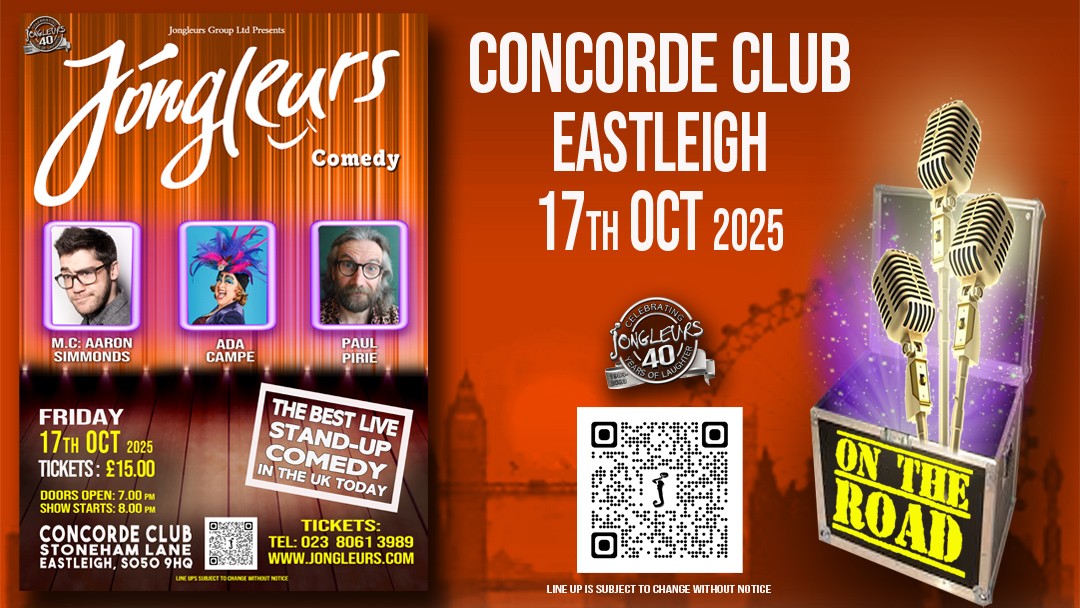 🎤 JONGLUERS COMEDY NIGHT – CONCORD CLUB📅 Friday 17th October 2025📍 Concord Club, Eastleigh🕖 Doors Open: 7.00PM | 🎭 Show Starts: 8.00PM🎟️ Tickets: Only £15 – available now at 👉 www.jongleurs.com Get ready, Eastleigh – because Jongleurs Comedy Club is back at the Concord Club for another unmissable night of big laughs, brilliant acts, and … Continued